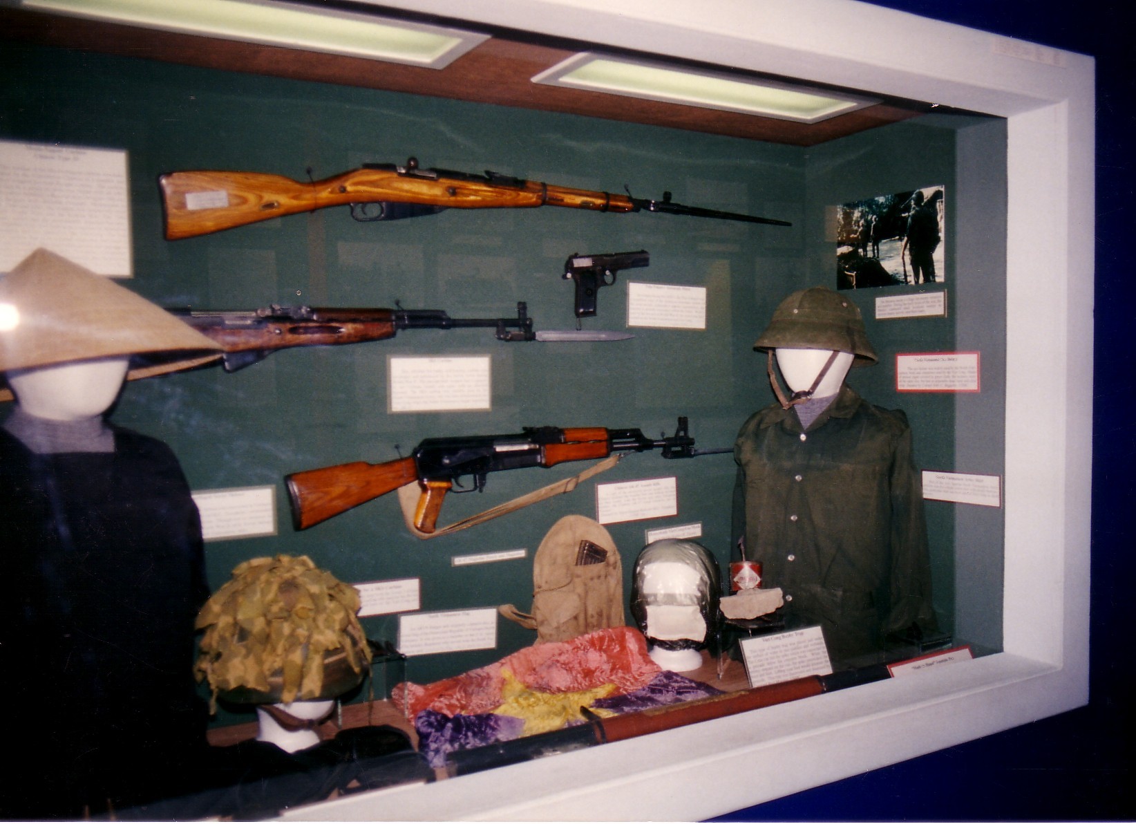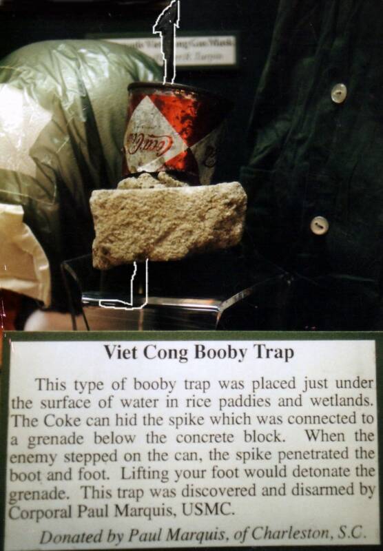In this photo you can view the booby trap on lower right as it sits in a display case in the Marine Museum at Paris Island. Also shown, are captured weapons, NVA flag. NVA helmet, and VC cover.