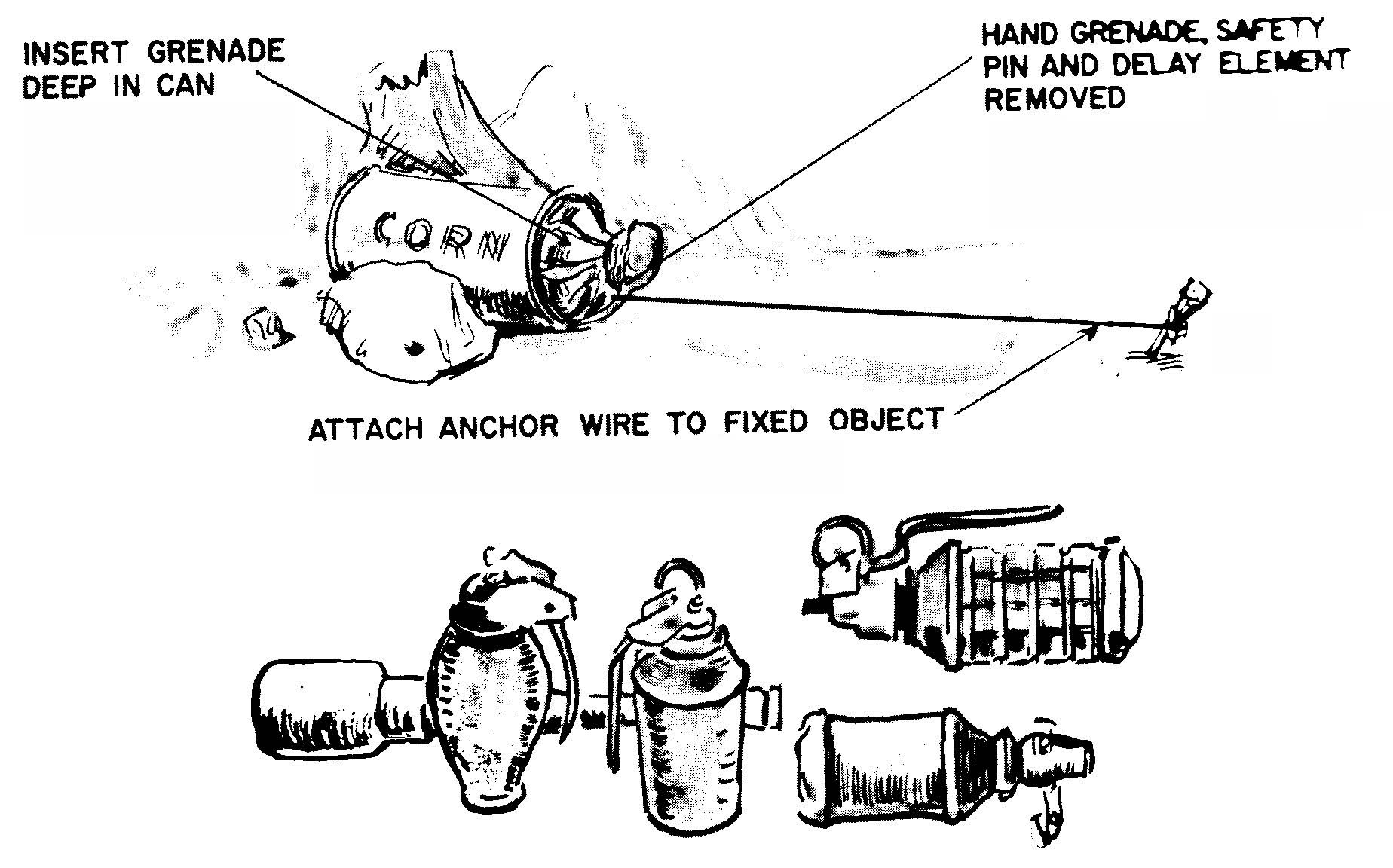 The illustration shows some typical grenades used and one of the most common devices. A grenade is placed in a can, the safety pin is removed and a trip wire is attached to the grenade. When the victim hits the trip wire, the grenade is pulled from the can and explodes. Normally a zero time delay fuze is used.
