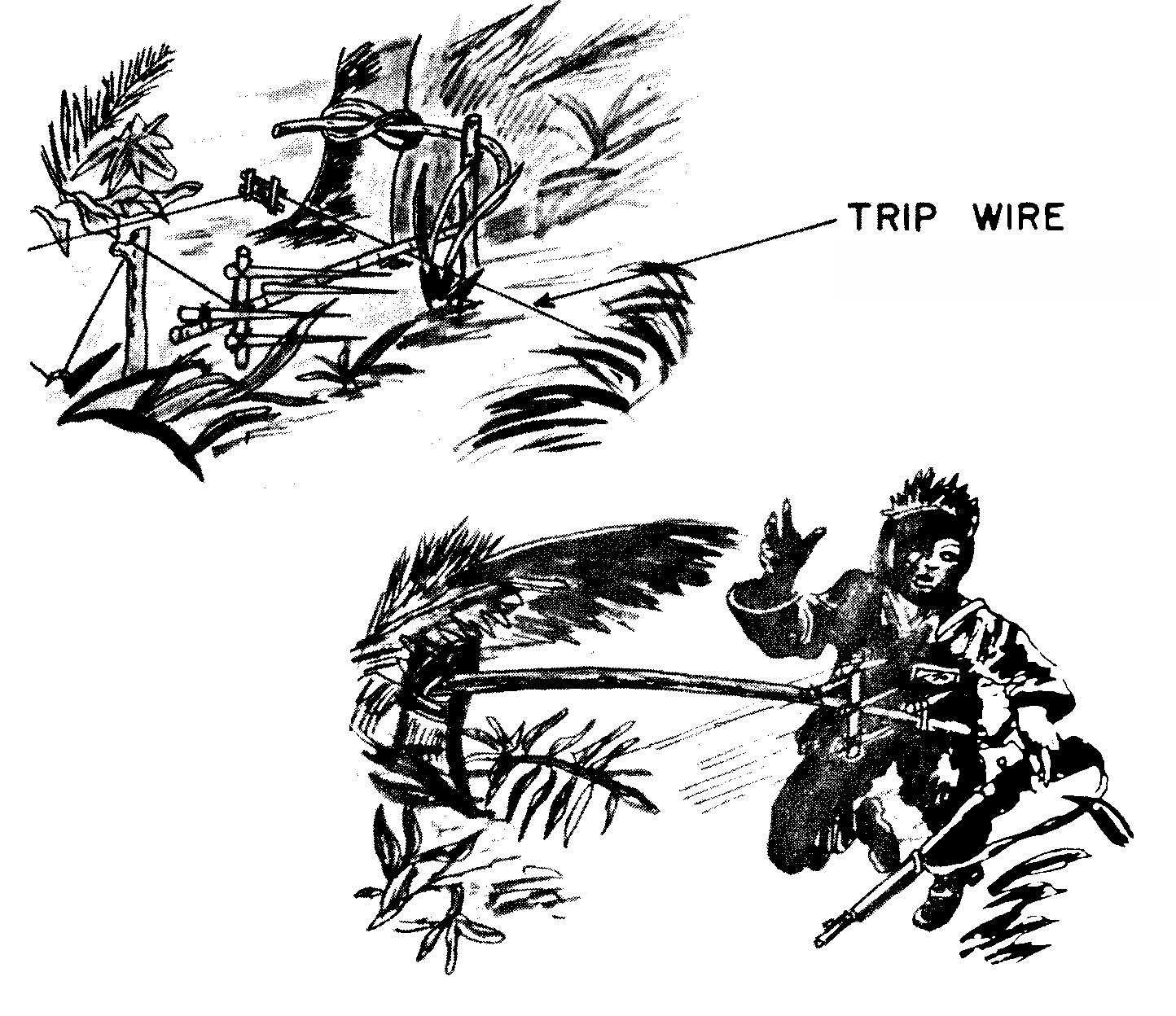 A bamboo whip is a piece of bamboo 1 to several meters long. A trip wire is used to bend the bamboo Like a cross bow. One end of the bamboo is mounted with spikes. When a man hits the wire, the curved bamboo will strike him in the leg or stomach. Generally, the victim is hit suddenly and can not take time to defend himself. Camouflage of the whip is difficult because of the length of the bamboo