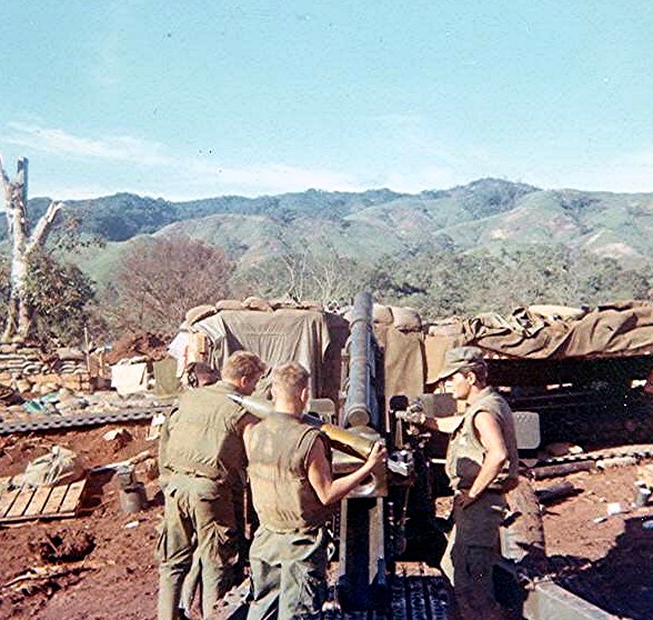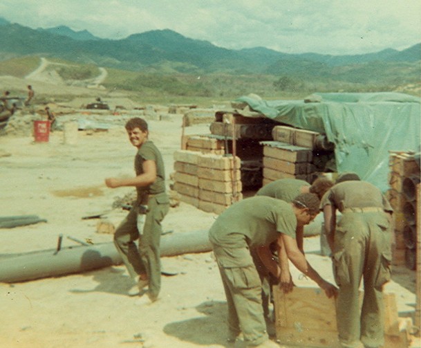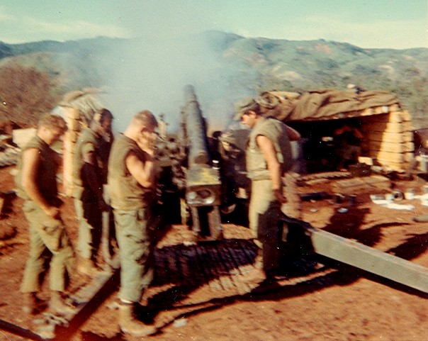 MIKE HINSON, TBD, CASEY, PAUL MARQUIS PULLING LANYARD AND JIM BLISS CUTTING POWDER BAGS INSIDE AMMO BUNKER