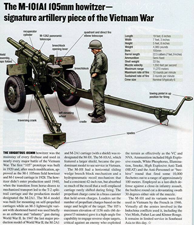 The M101A1 105mm Light Howitzer, Towed is a general purpose, light field artillery weapon consisting of a cannon, 105mm howitzer (M2A2); recoil mechanism, M2 series; and carriage, 105mm Howitzer, M2A2. It can be used for direct or indirect fire.