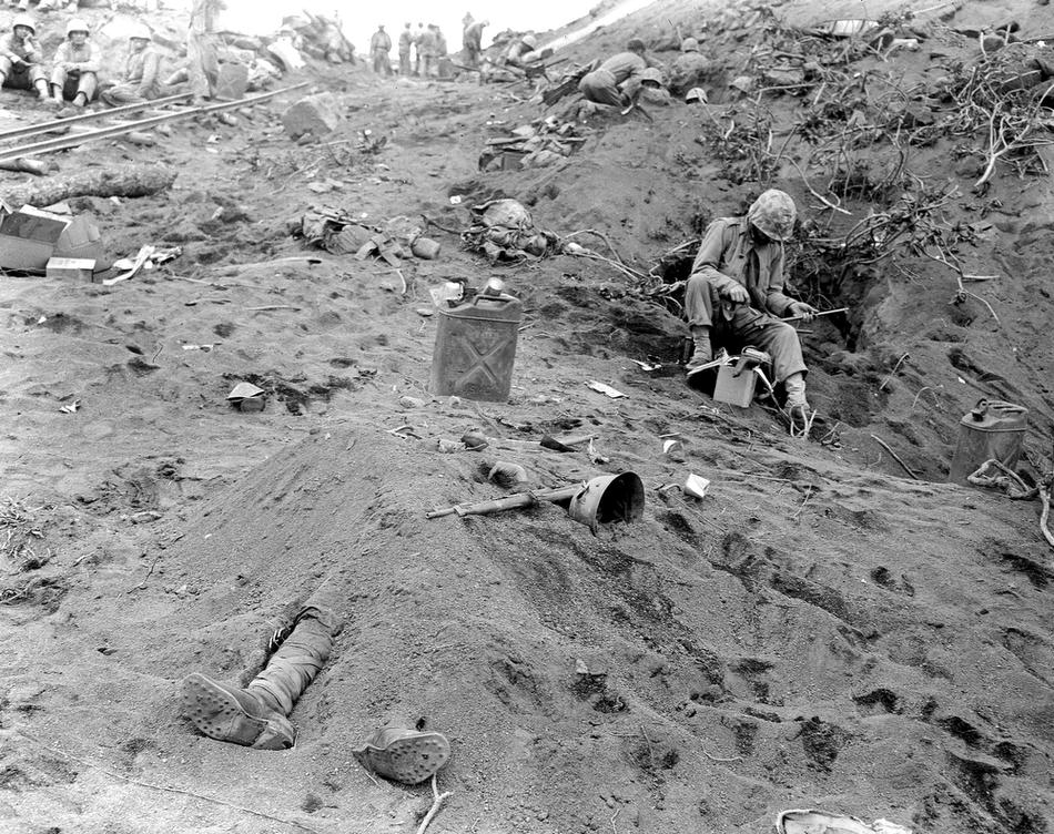 The booted feet of a dead Japanese soldier, foreground, protrude from beneath a mound of earth on Iwo Jima during the American invasion of the Japanese Volcano Island stronghold in 1945 in World War II. U.S. Marines can be seen nearby in foxholes. (AP Photo/Joe Rosenthal)