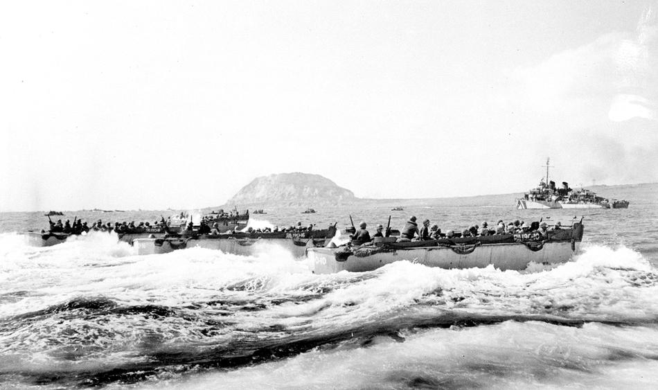 U.S. Marines aboard a landing craft head for the beaches of Iwo Jima Island, Japan, on Feb. 19, 1945 during World War II. In the background is Mount Suribachi, the extinct volcano captured by the Marines after a frontal assault. (AP Photo/Joe Rosenthal)