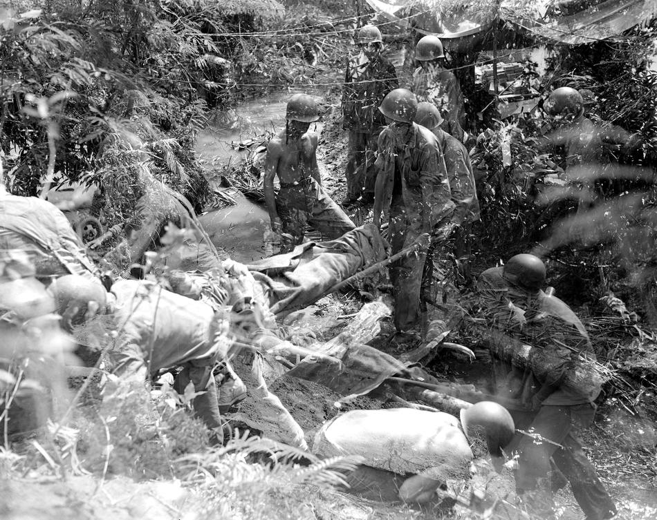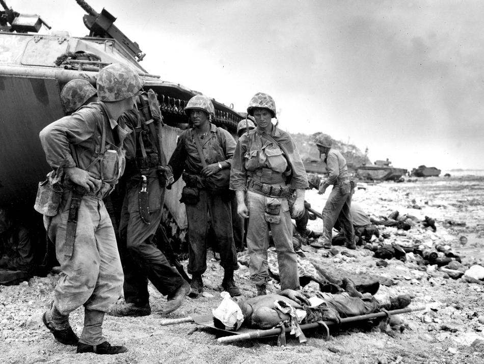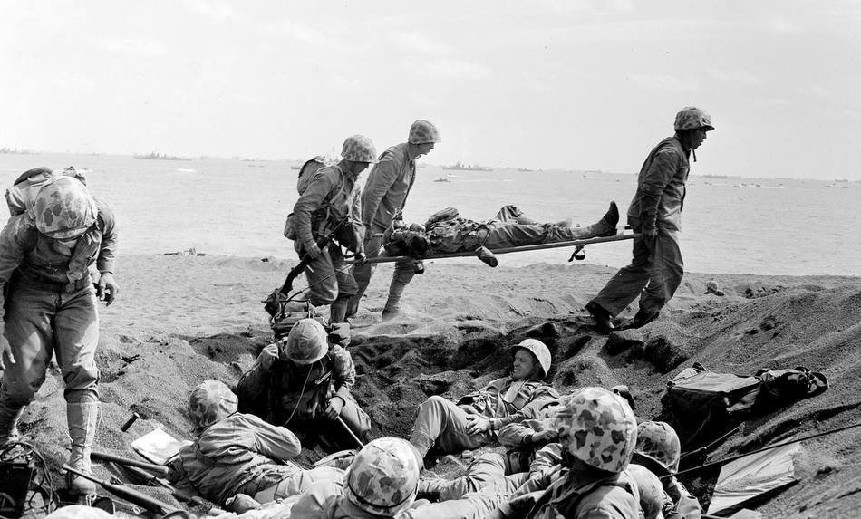 Wounded soldiers are carried on stretchers towards a beach where they will be evacuated to a hospital ship, Guam, Mariana Islands, Jul. 27, 1944. (Eds Note: Possible Double exposure.) (AP Photo/Joe Rosenthal)