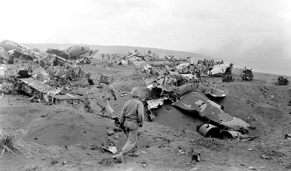 U.S. Marines walk amid wreckage of Japanese planes alongside Motoyamo Airstrip No. 1 that were brought down during aerial bombing and naval shelling prior to American invasion of Iwo Jima, Japanese Volcano Island stronghold, March 1, 1945. (AP Photo/Joe Rosenthal)