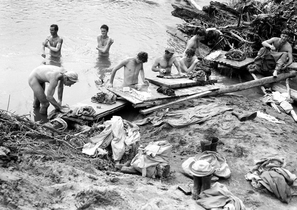 Soldiers of a parachute unit wash their bodies and clothes, New Guinea, Jul. 11, 1944. (AP Photo/Joe Rosenthal)