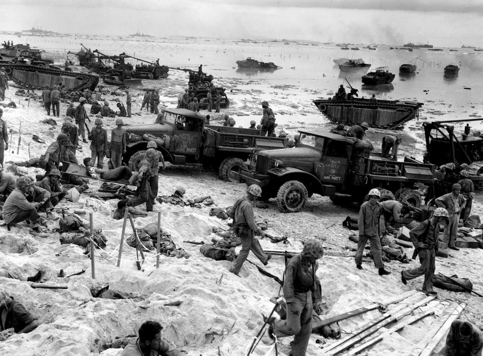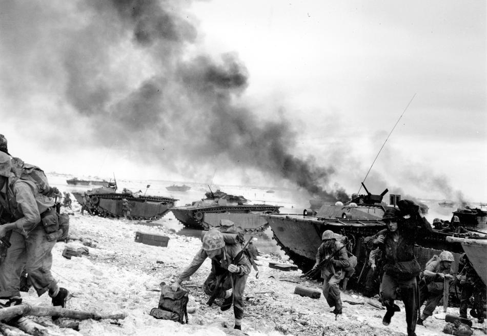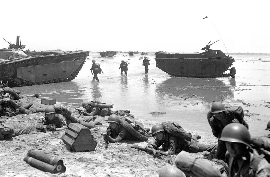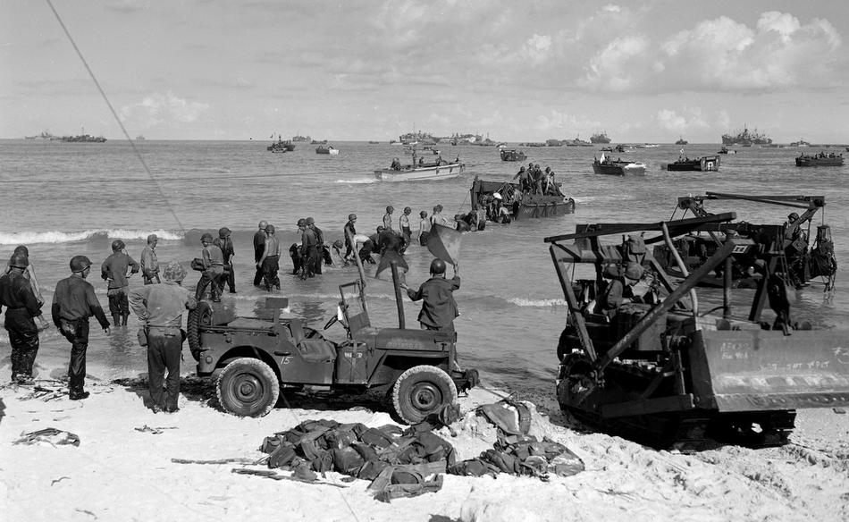 Marines land on coral reefs during U.S./Japanese warfare, Guam, Mariana Islands, Jul. 21, 1944. (AP Photo/Joe Rosenthal)