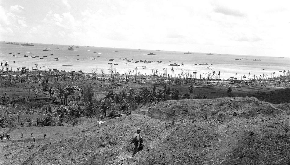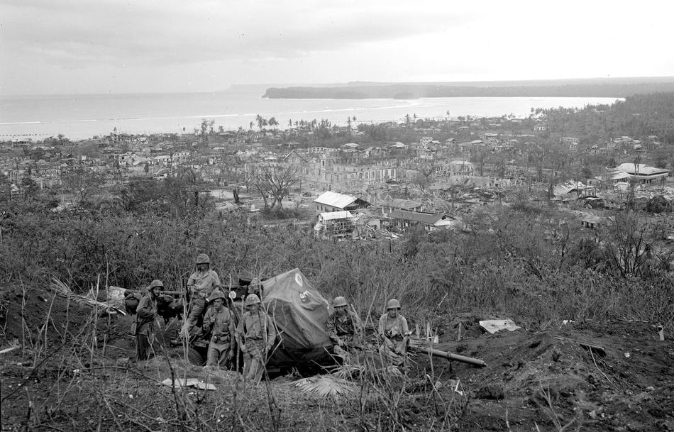 Guam in the Mariana Islands is pictured on Jul. 27, 1944, during U.S./Japanese warfare. (AP photo/Joe Rosenthal)