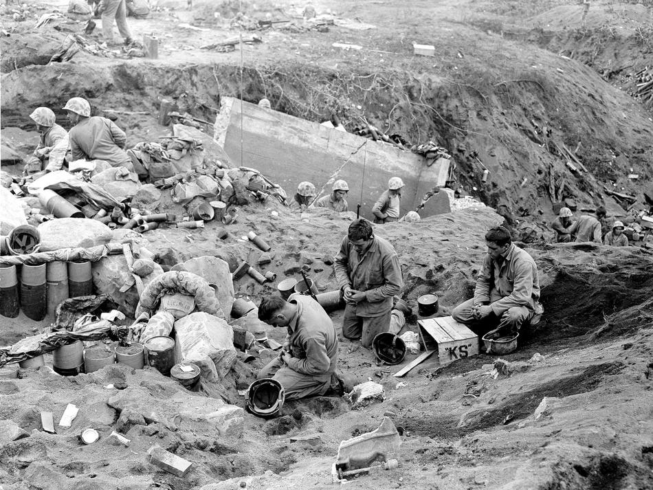 U.S. Marines kneel in prayer before they receive communion during a pause in the fighting for Motoyam Airstrip No. 1 on Iwo Jima, Volcano Island of Japan, March 1, 1945 in World War II. The soldiers, from left are , Pfc. Edmond L. Fadel, Niagara Falls, N.Y.; Pvt. Walter M. Sokowski, Syracuse, N.Y.; and Pvt. Nicholas A. Zingaro, Syracuse, N.Y. (AP Photo/Joe Rosenthal)