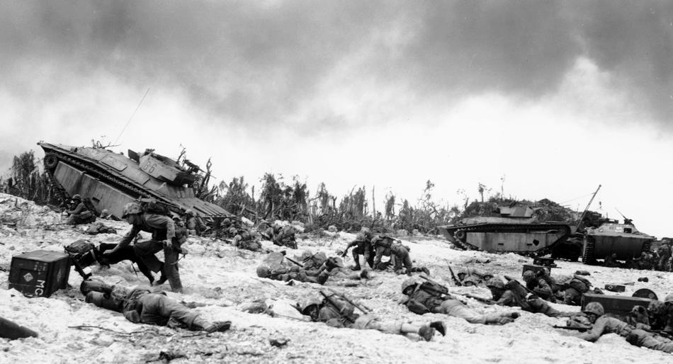 Supported by tanks, Marines of the 1st U.S. Division inch their way up on the beach of Peleliu, during the invasion of the island in the Palau group, on September 14, 1944. (AP Photo/Joe Rosenthal)