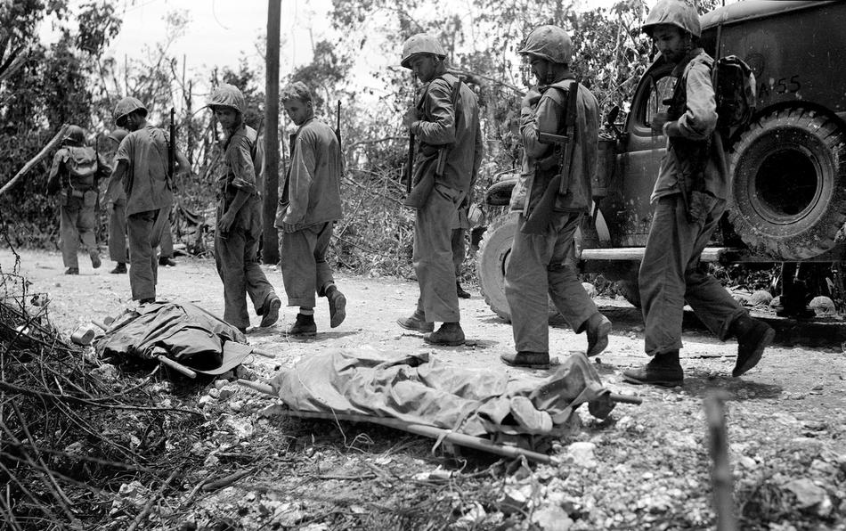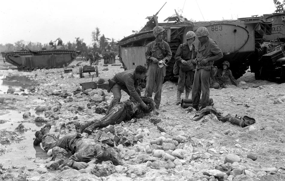 U.S. Marines of the first Marine Division stand by the corpses of two of their comrades, who were killed by Japanese soldiers on a beach on Peleliu island, Republic of Palau, Sep. 14, 1944. (AP Photo/Joe Rosenthal/Pool)