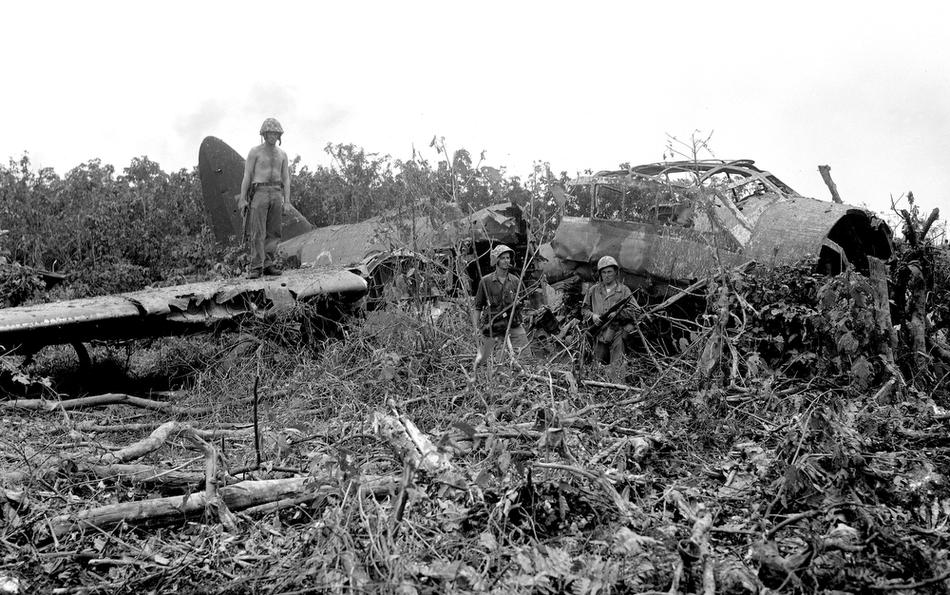 Soldiers stand by a crashed Japanese bomber on Peleliu, Republic of Palau, Sep. 22, 1944. (AP Photo/Joe Rosenthal)