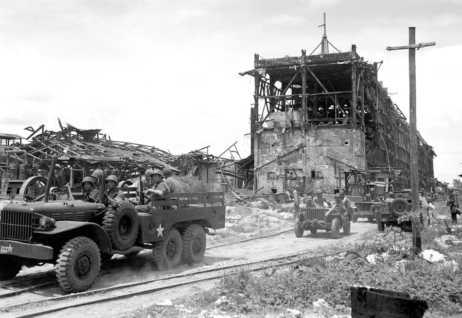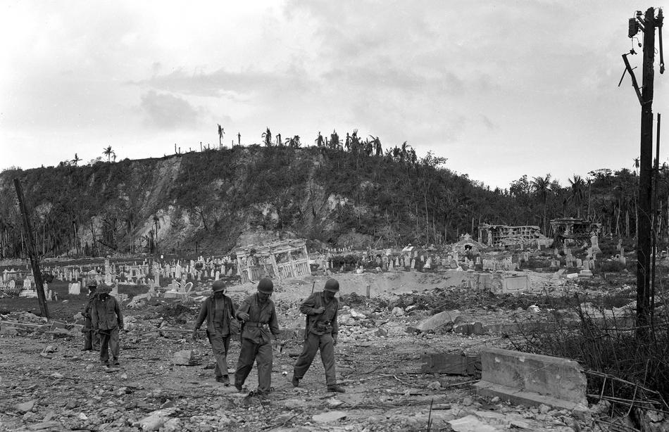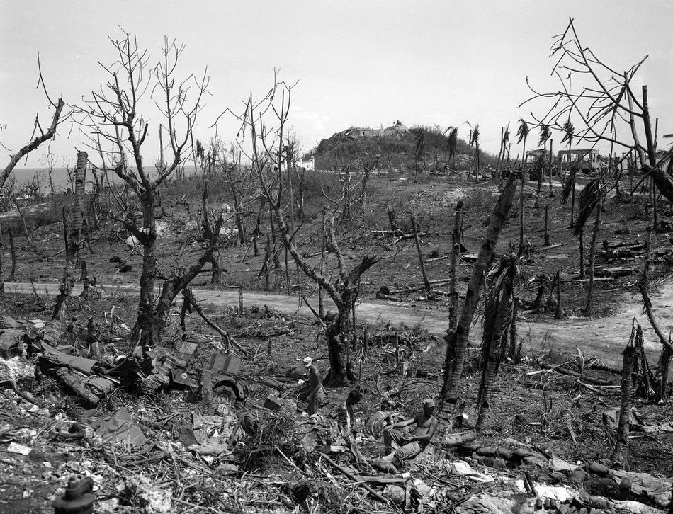 U.S. soldiers walk by a bombed out cemetery in Agana, Guam, Aug. 9, 1944. (AP Photo/Joe Rosenthal)