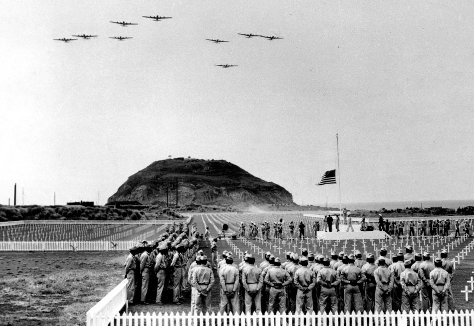 Memorial services are conducted at an Iwo Jima cemetery on Feb. 20, 1947. Four-engined military planes soar overhead and the U.S. flag is at half staff in honor of those who died in the 1945 invasion of the then Japanese held island. Mt. Suribachi is in the background. (AP Photo/Joe Rosenthal)4