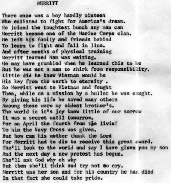 Disregarding his painful wounds, and aware of the desperate need for artillery fire and the needs of fellow Marines, he refused to leave his radio and continued to adjust artillery fire upon the enemy and relay their situation until he succumbed to his wounds with his radio handset in his hands. By his bold initiative, gallant fighting spirit and selfless devotion to duty, he was instrumental in repulsing a large scale attack and saving the lives of the beleagured Marines, reflecting great credit upon himself and the United StatesMarineCorps and upholding the highest traditions of the United States Naval Servi ce. He gallantly gave his life for his country.