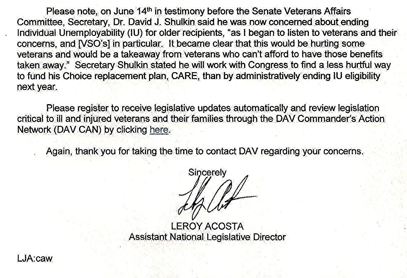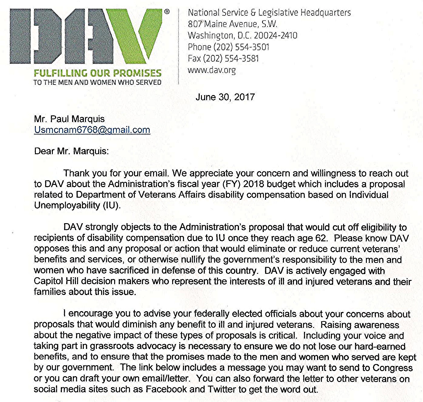 News came out from the VA that the budget is looking at the options to reconsider IU after a certain age. I think the plan is to drop the IU after age 62. If this happens, many Veterans? will be hurt and some will be homeless. Veteran?s that were IU before being able to save for a retirement will be falling between the cracks. They have served our country and through no fault of their own have become so disabled that they could no longer work. Many will have only a small Social Security check to fall back on. We know the average amount being very small to live off. Social Security was meant to be a supplement to what people saved to retire on. These Veterans were not able to build a retirement through the normal means, such as an IRA account. Pensacola has a large military population with many of its Veteran?s being disabled. I feel that if we can give money to other countries, we can keep the IU for our Veterans. What will the VFW do to prevent this from happening?